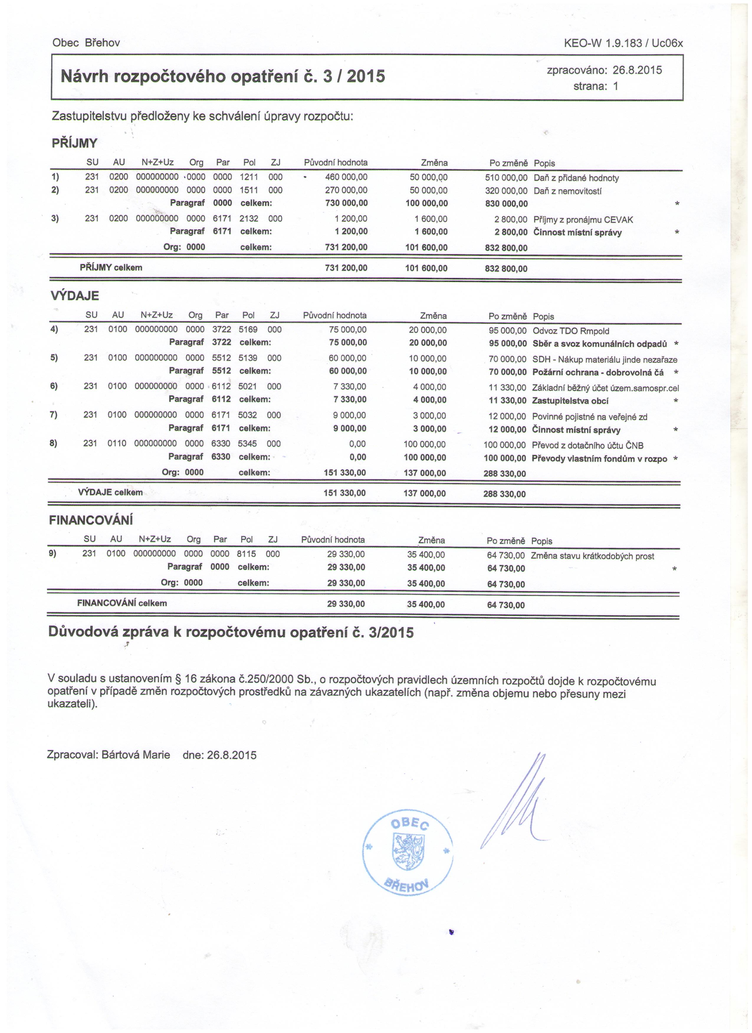 Rozpočtové opatření č. 3/2015